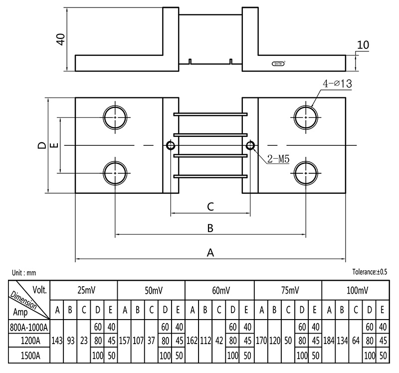• .Temperature rise: Electrify the shunt with rated current for 2hr, test it after temperature rising stable, the temperature rise should be≤80K when the rated current under 100A; and should be ≤120K when the rated current higher than 100A.