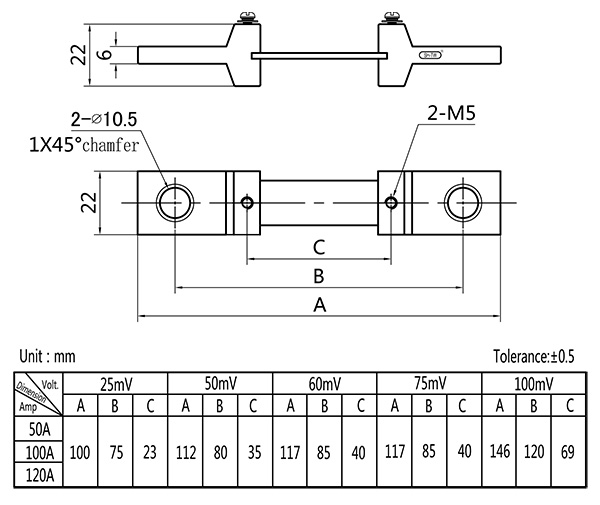 • .Temperature rise: Electrify the shunt with rated current for 2hr, test it after temperature rising stable, the temperature rise should be≤80K when the rated current under 100A; and should be ≤120K when the rated current higher than 100A.