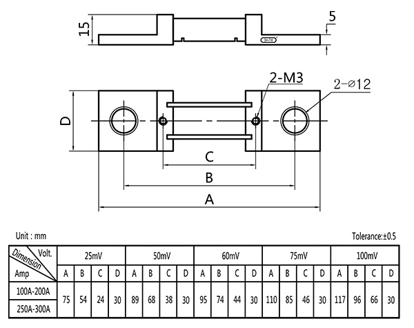 • .Temperature rise: Electrify the shunt with rated current for 2hr, test it after temperature rising stable, the temperature rise should be≤80K when the rated current under 100A; and should be ≤120K when the rated current higher than 100A.